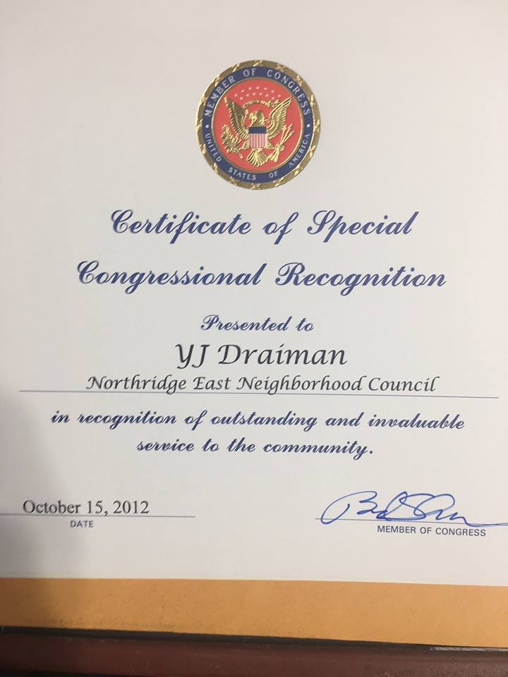 YJ Draiman is the fourth term lead elected official for the Northridge East Neighborhood Council – NENC; he is also the liaison between the NENC and LADWP. As an Energy Efficiency Advocate YJ Draiman is known for his advancement in implementing Energy efficiency, Renewable energy and Water conservation in the Los Angeles Area. YJ Draiman is promoting his platform of Made in America to bring back to the city of Los Angeles a strong industrial base, increase employment, strengthen education and reduce government and implement fiscal responsibility.